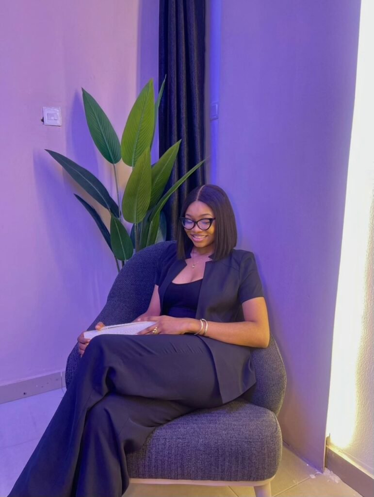 Her pose reflects heaviness of deep reflection. She’s bending inward not from defeat Buh from processing life’s quiet storms. she’s thinking, growing and preparing to rise again.